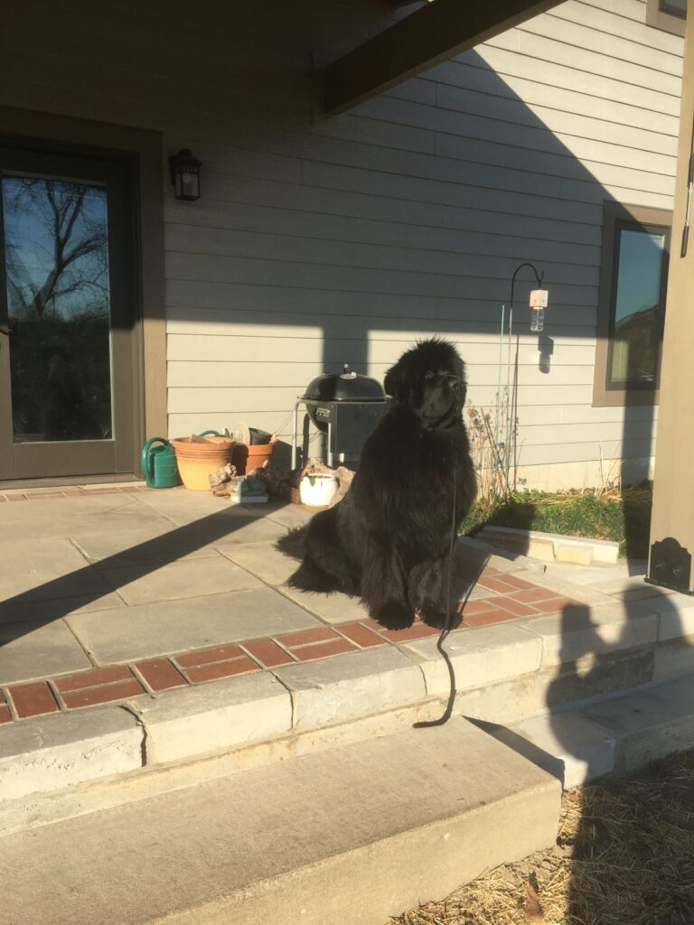 It is a brilliant, cold morning on the outskirts of southwest Missouri, with a north breeze and a total of 9 degrees. “9” is the favorite Newfoundland number here, and Grace fully embraced that. When I took her out to relieve herself, which of course was not a quick trip, on the way back she began studying a bird. Grace, as Holly was, is fascinated with creatures that can fly. She continued her sky-gazing with reservation about going back inside, while I was a lot more interested in going back inside. I finally looked up, and the bird circling directly over our house was a Bald Eagle!
